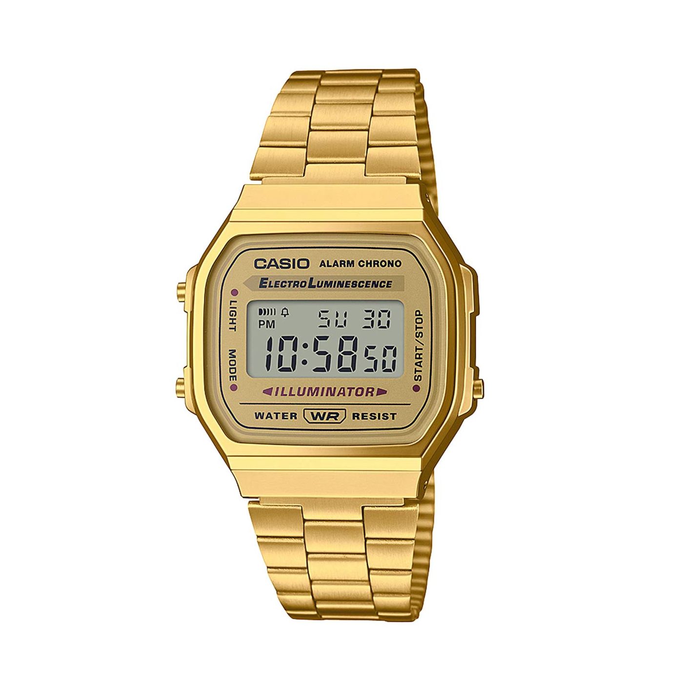 Shine bright with the Casio A168WG-9EF. This gold-tone digital watch offers a classic Casio design with a touch of luxury. Featuring a stainless steel band, daily alarm, stopwatch, and an illuminator backlight, it’s the perfect blend of style and functionality.