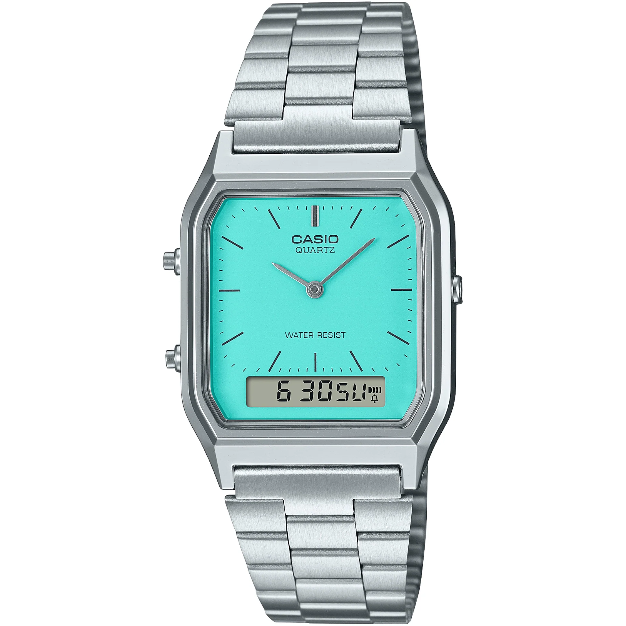 Experience the best of both worlds with the Casio AQ-230A-2A1. This sophisticated timepiece seamlessly blends classic analog design with modern digital functionality. The striking blue dial, complemented by silver-tone hands and indices, creates a truly eye-catching look, while the integrated digital display offers a range of convenient features.