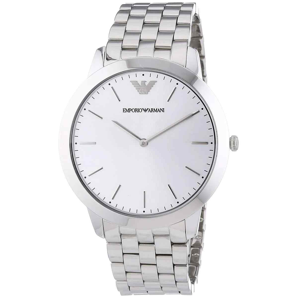 This Emporio Armani AR1745 men’s watch offers a timeless and sophisticated aesthetic with its sleek, silver-toned design. The classic round case measures 42mm in diameter and 7mm thick, perfectly sized for everyday wear. The matching silver stainless steel bracelet, 20mm wide, features a secure folding clasp. Protected by a durable mineral crystal, the silver dial complements the overall polished look. Powered by a precise quartz movement, this watch offers reliable timekeeping and is water-resistant up to 30 meters (3 ATM), suitable for splashes and brief immersion in water. The fixed bezel adds to the watch’s clean lines and minimalist appeal. A perfect blend of style and functionality, this Emporio Armani timepiece is an ideal accessory for any occasion.