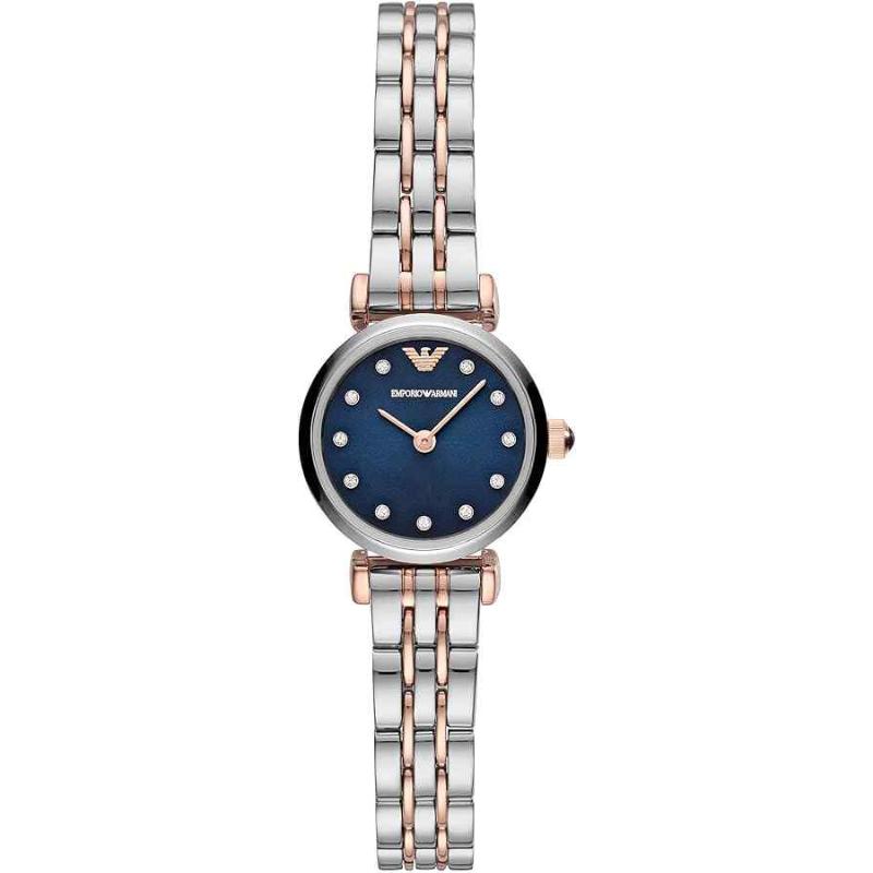 The Emporio Armani AR11222 from the Gianni T-Bar collection is a charming and refined ladies’ timepiece. This small 22mm watch is crafted in stainless steel with rose gold PVD accents on the bezel and bracelet links. The fixed bezel frames a striking blue sunray dial with simple stick indices. The T-Bar lugs provide a delicate, jewellery-inspired look. Powered by a reliable quartz movement and water-resistant to 30 meters, the AR11222 is a perfect blend of delicate design and versatile, contemporary style.