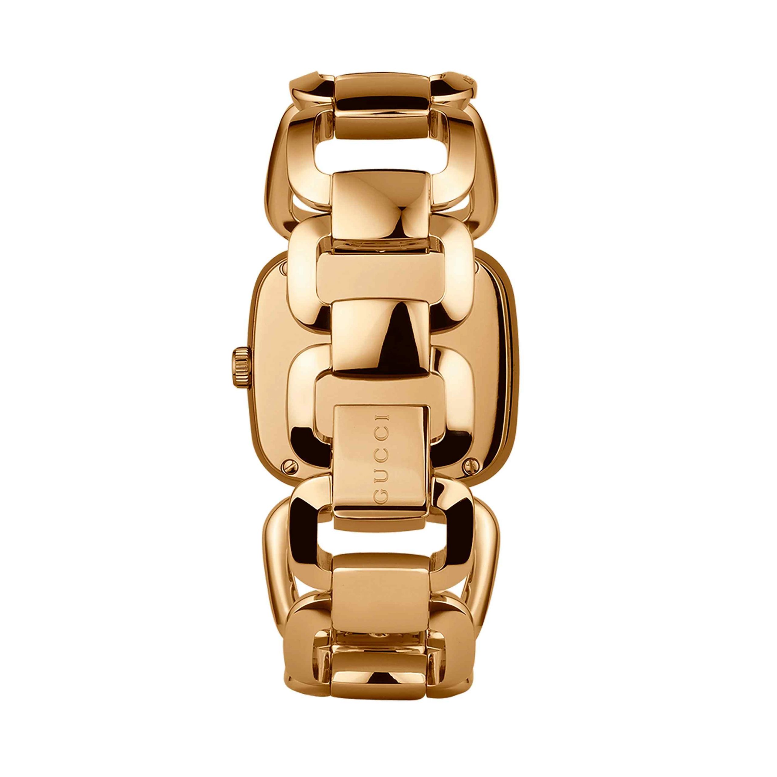 The elegant Gucci G-Gucci YA125408 is a beautiful jewelry-inspired ladies’ watch. Its distinct rectangular G-shaped case and bracelet are finished in luxurious yellow gold PVD, perfectly complementing the rich brown sunburst dial.