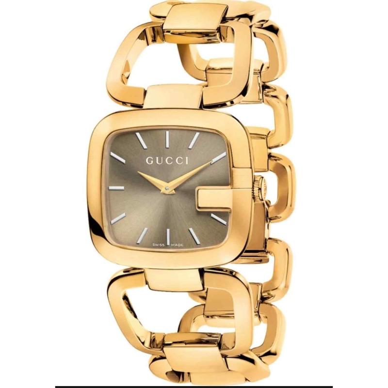 Sophistication is effortless with the Gucci G-Gucci (YA125408). Designed with a uniquely elegant, feminine aesthetic, this small-sized ladies watch features the signature 32mm G-shaped rectangular yellow gold PVD-plated stainless steel case. The matching bracelet flows seamlessly into the case, creating a fluid, jewellery-like appearance. The warm brown sunburst dial is minimalist, featuring subtle yellow gold-tone hands and indices. Driven by a Swiss quartz movement and protected by a sapphire crystal, this timepiece is a perfect embodiment of classic Gucci luxury.