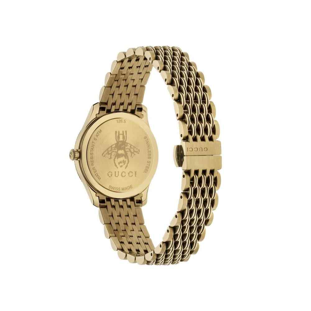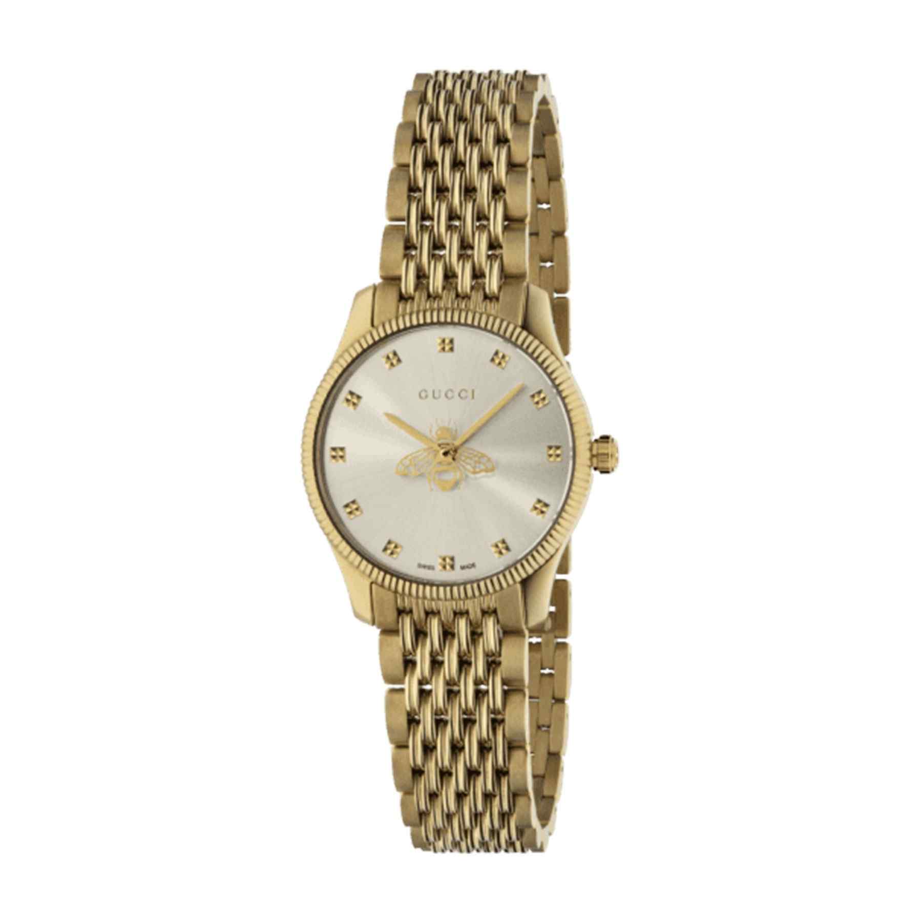 The luxurious Gucci G-Timeless YA1265021 features a 29mm polished gold PVD case with a knurled bezel, a sophisticated gold dial adorned with an iconic Bee motif and intricate indices, and a unique gold PVD Milanese mesh bracelet.