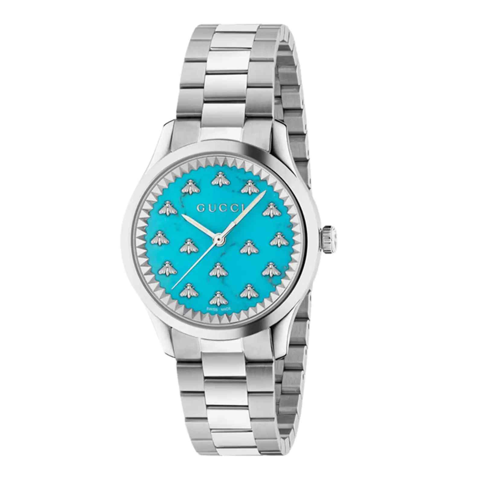 The elegant Gucci G-Timeless YA1265044 features a 29mm polished stainless steel case with a knurled bezel, a vibrant turquoise dial adorned with multiple Bee motifs as hour markers, and a refined stainless steel bracelet.