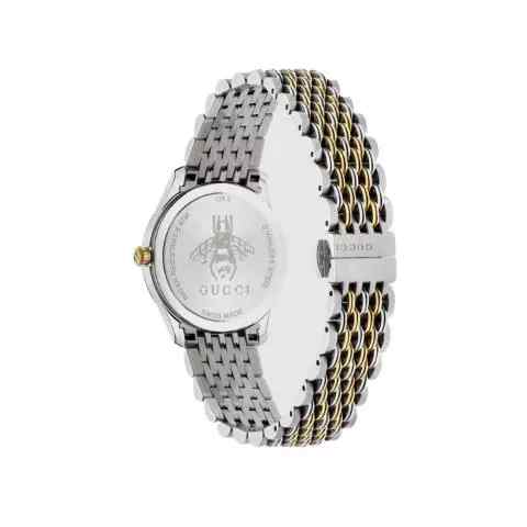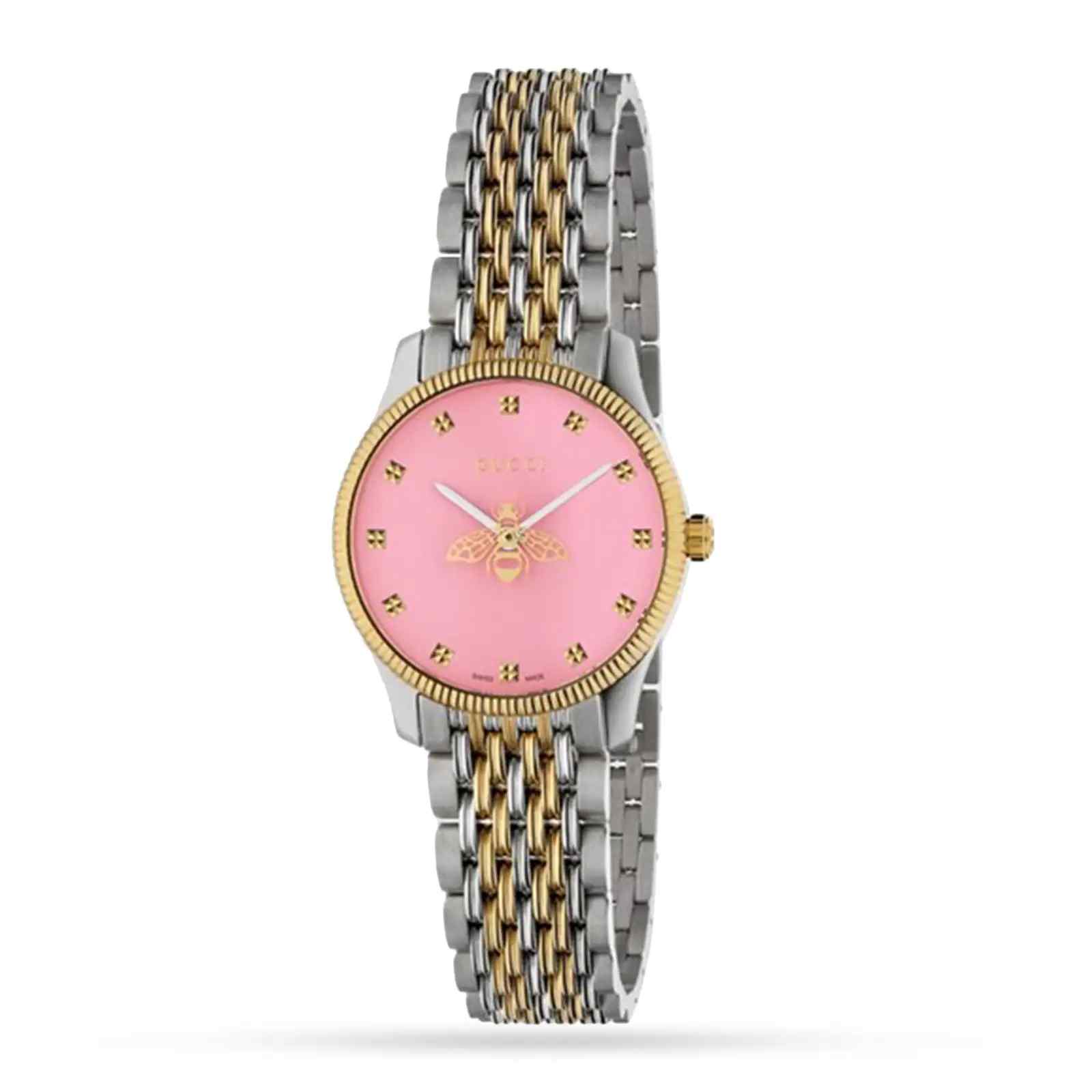 The elegant Gucci G-Timeless YA1265030 features a 29mm stainless steel case with a gold PVD knurled bezel, a charming pink dial adorned with an iconic gold-tone Bee motif and intricate indices, and a unique two-tone Milanese mesh bracelet.