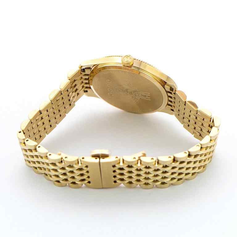 Discover the elegant subtlety of the Gucci G-Timeless Slim YA1264155 Ladies’ Watch, available now at easy-watches.com. This timepiece is designed for a refined, understated wrist presence with its slender profile and perfectly proportioned 36mm case. The entire watch, from the case to the bracelet, is finished in a luxurious yellow gold PVD coating, providing a consistent, opulent shine. The silver sunbrushed dial is the canvas for the iconic Gucci Bee motif, which is used as the primary hour marker at 12 o’clock, alongside other subtle house symbols. Powered by a reliable Swiss quartz movement and protected by scratch-resistant sapphire crystal, the YA1264155 is a precision accessory that beautifully marries iconic branding with slim, golden elegance.