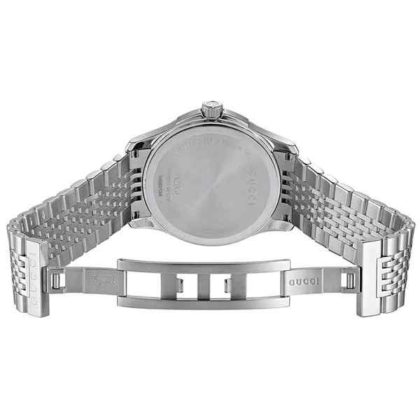 Discover the enduring versatility of the Gucci G-Timeless YA126402 Watch, available now at easy-watches.com. This is a core piece of the G-Timeless collection, characterized by its clean, contemporary aesthetic and subtle Gucci branding. The watch features a classic black dial accented by the iconic Gucci logo pattern and a practical date window. The markers may feature a subtle combination of the signature bee motif or sleek baton indexes. Sized at a versatile 38mm, the timepiece is housed in a polished stainless steel case and paired with a smooth stainless steel bracelet. Powered by a reliable Swiss quartz movement, the YA126402 is an investment in timekeeping precision and timeless Italian luxury.