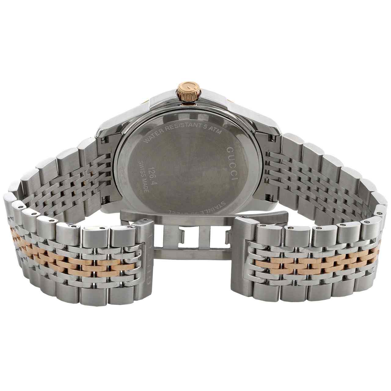 Introduce a touch of contemporary warmth to your collection with the Gucci G-Timeless YA126410 Two-Tone Watch, available now at easy-watches.com. This refined 38mm men’s watch features an elegant black diamond-patterned dial with practical date functionality. The dial’s dark depth is beautifully contrasted by the luminous rose gold PVD coating applied to the bezel and central bracelet links. The use of rose gold PVD alongside the brushed stainless steel case provides a modern, sophisticated aesthetic. Powered by a reliable Swiss quartz movement and protected by scratch-resistant sapphire crystal, the YA126410 is a blend of precision timekeeping and subtle, high-fashion luxury. This G-Timeless model is a superb choice for the man looking for an everyday watch with an elevated, contemporary twist.