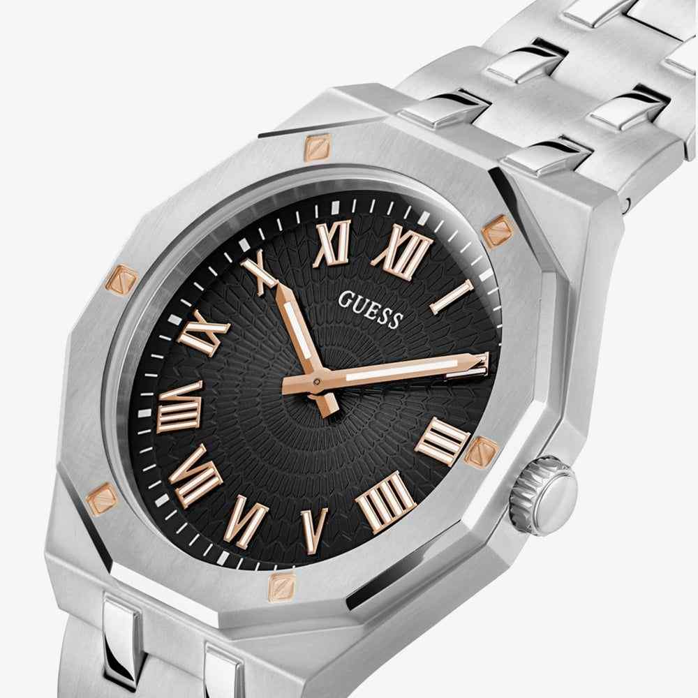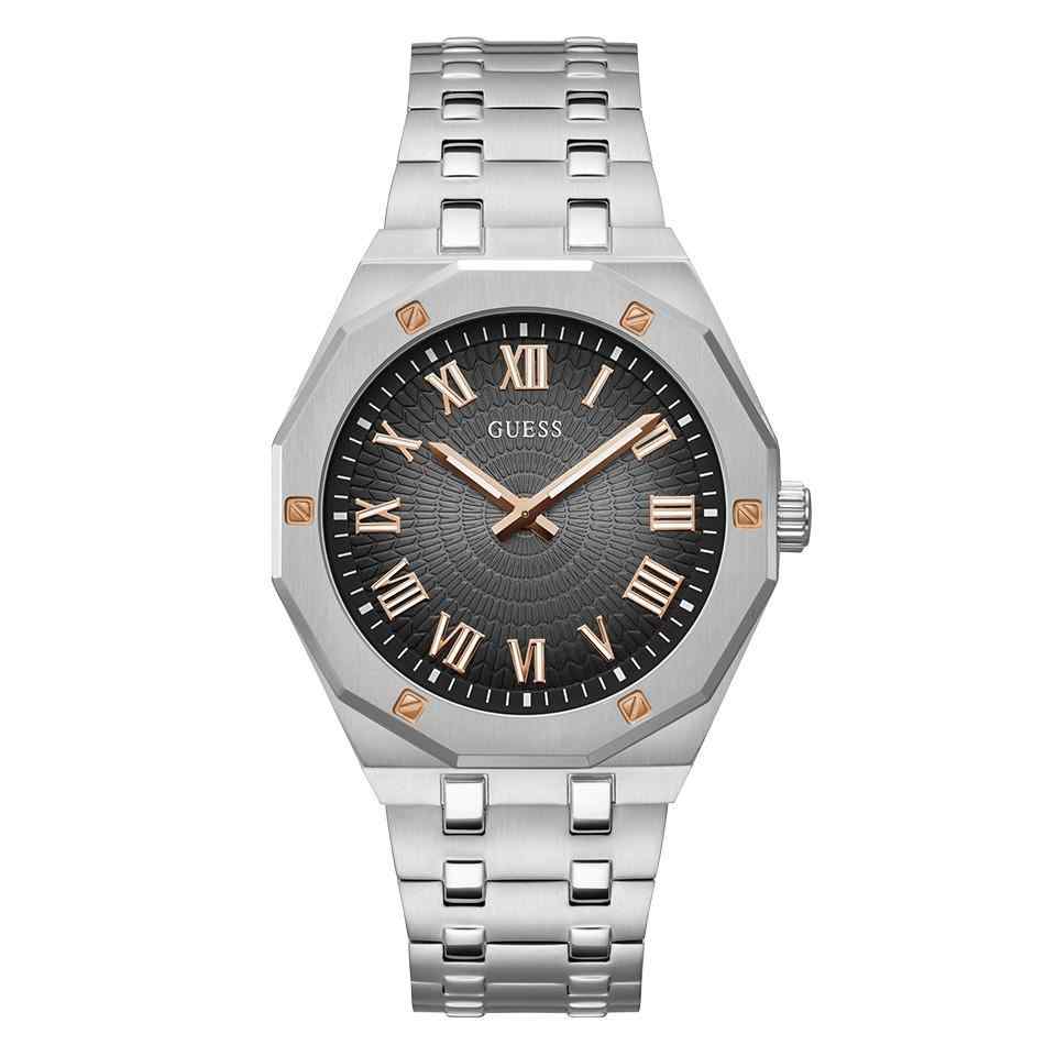 The Guess Asset GW0575G1 is a powerful and reliable men’s timepiece with a strong sport aesthetic. This 42mm watch is crafted entirely from polished stainless steel, including its case and robust integrated bracelet. The fixed, smooth bezel frames a highly legible black dial featuring bold, luminous baton and dot indices. The dial often includes subtle Guess logo patterning for texture. Powered by a reliable quartz movement and water-resistant to 50 meters, this Asset timepiece is built for durability and sophisticated style, making it an excellent choice for a powerful, minimalist watch.