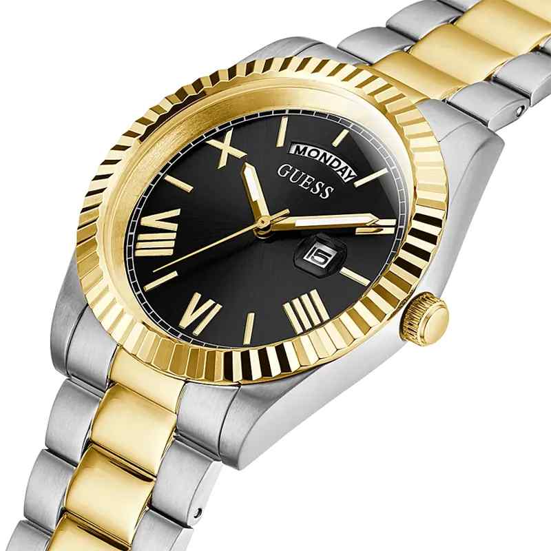 The Guess Connoisseur GW0265G5 is a refined men’s timepiece that pays homage to classic luxury designs. This 42mm watch features a polished stainless steel case with gold PVD-plated accents on the bezel and bracelet links, creating a timeless two-tone look. The sophisticated black dial provides a clean backdrop for the sub-dials displaying the day and date, along with the 24-hour time. This quartz-powered watch offers reliable multifunction capability and is water-resistant to 50 meters. The Connoisseur is the perfect accessory for the man who seeks classic elegance and dependable daily utility.