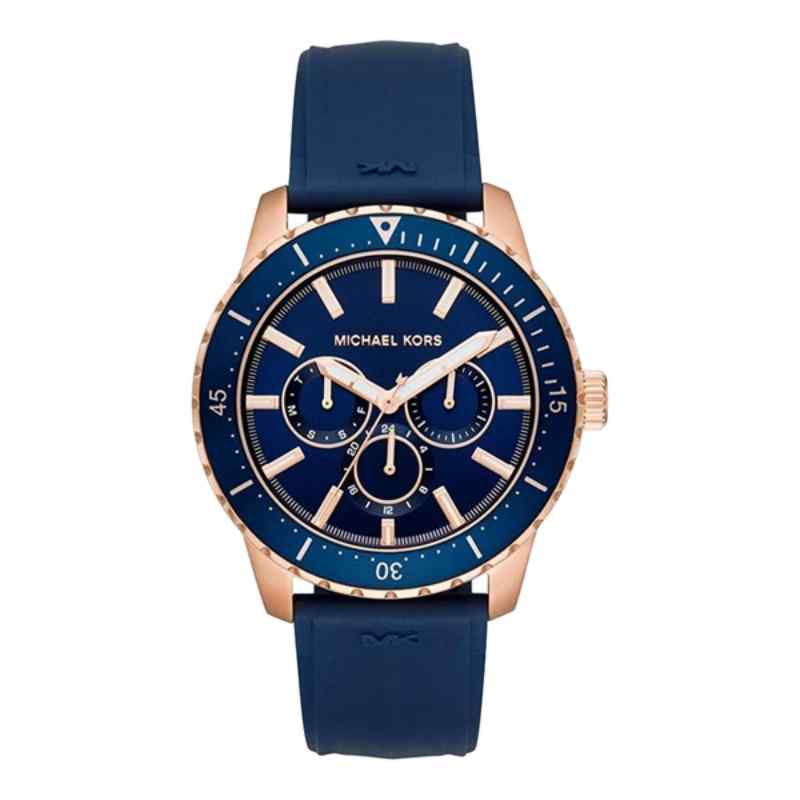 Stay stylish and on time with this striking Michael Kors Cunningham men’s watch. Featuring a vibrant blue silicone strap and a blue dial accented with rose gold details, this timepiece offers a sporty yet sophisticated look perfect for everyday wear. The durable stainless steel case ensures lasting quality, while the quartz movement provides precise timekeeping.